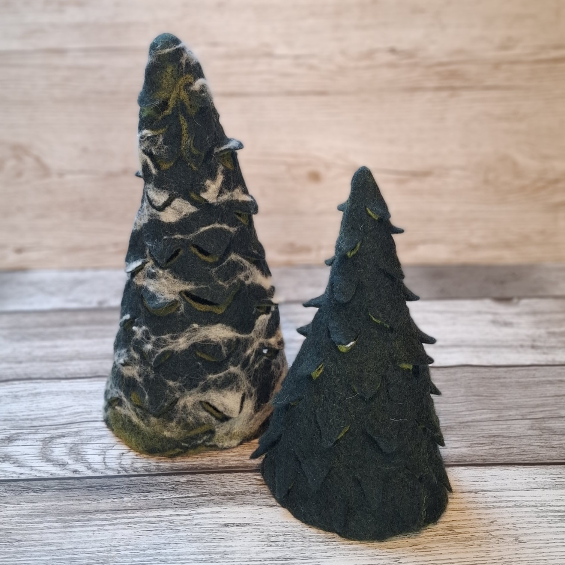 Diese Bäume sind nassgefilzt und innen hohl. Eine leichte Variante, die auch inneinander gestapelt werden kann.