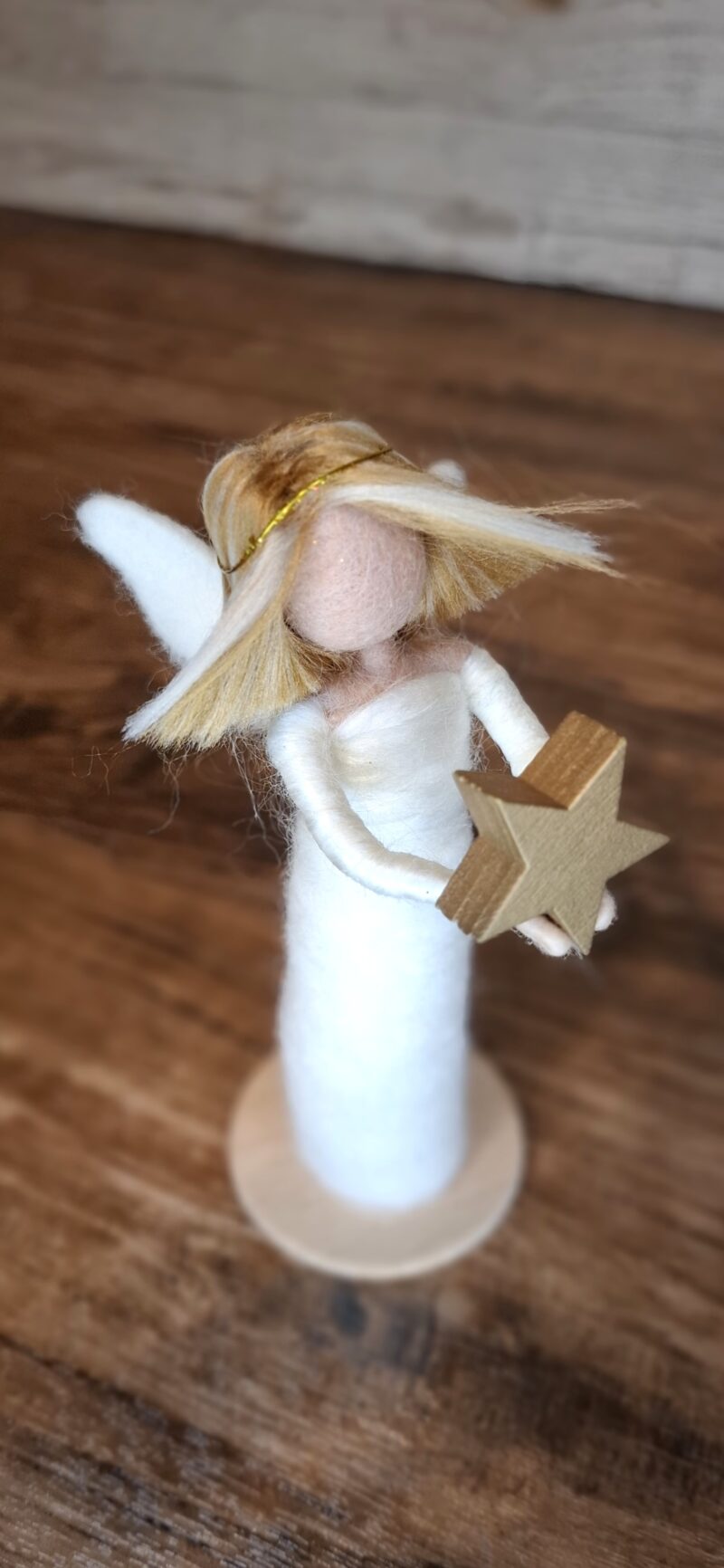 Ein nadelgefilzter Engel, stehend auf einer Holzscheibe. Dieser Engel hat von mir wuderschöne und zarte Flügel aus Filzwolle und Draht bekommen. Der Engel hält einen Stern aus Holz in den Händen.